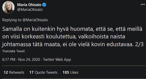 Yhdysvaltojen politiikka ei sovi Suomeen. Meillä on erilainen historia. Tuhat vuotta sitten kantasuomalaiset asettautuivat näille alueille ja selviytyivät. Sittemmin suomalaiset ovat rakentaneet tämän maan kovalla työllä. Nyt poliittisista syistä heidän jälkeläisiään yhtäkkiä moititaan valkoisiksi ja siksi perusolemukseltaan rasisteiksi. Ohisalon twiitti ammentaa tästä vasemmistopopulistisesta näkökulmasta.