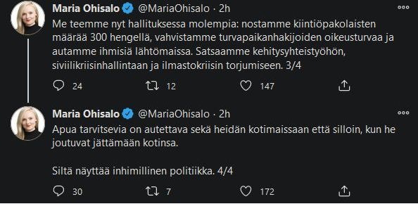 Myöhemmin Ohisalo palasi jälleen maahanmuuttoon, tällä kertaa sivaltaakseen kokoomuksen Petteri Orpoa, joka penäsi turvapaikkapolitiikan kiristämistä.