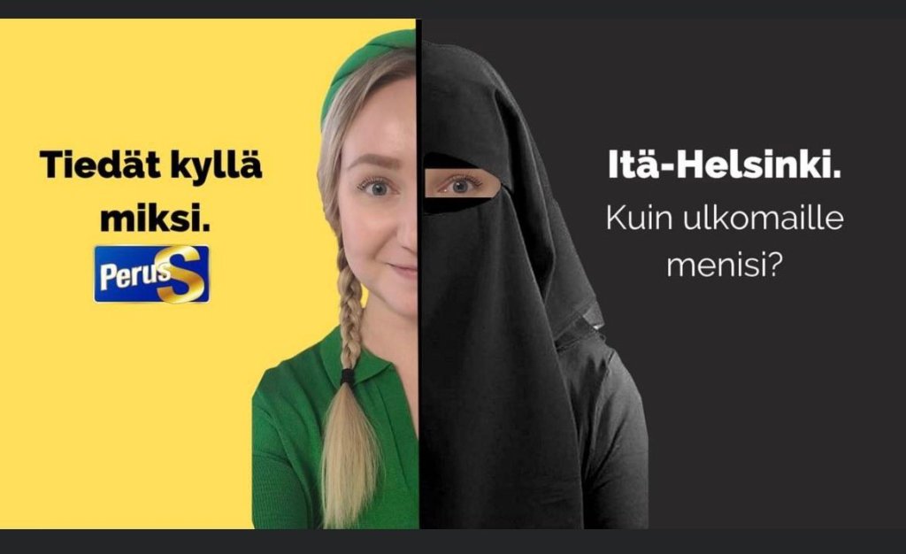 Perussuomalaisten eduskuntavaaliehdokas Laura Jokela, Helsingin vaalipiiristä, julkaisi vaalimainoksenaan puhuttelevan kuvaparin, jossa hän on kuvitteellisesti pukeutunut naisia alistavaan uskonnolliseen symboliin ja kysyy, onko Itä-Helsinki enää suomalainen?