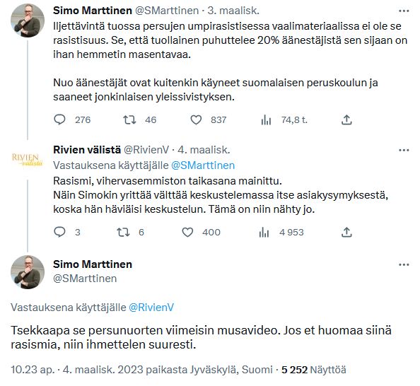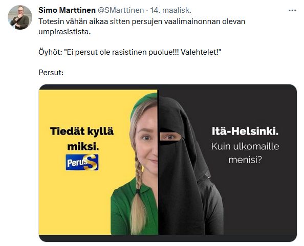 Huomioidaan sekin, että Martinen leimasi myös Perussuomalaisen nuorison musiikkivideota umpirasistiseksi.