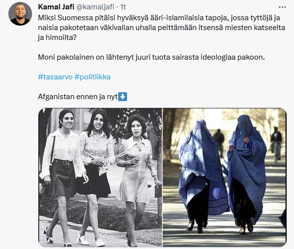 Miksi Suomessa pitäisi hyväksyä ääri-islamilaisia tapoja, jossa tyttöjä ja naisia pakotetaan väkivallan uhalla peittämään itsensä miesten katseelta ja himoilta?