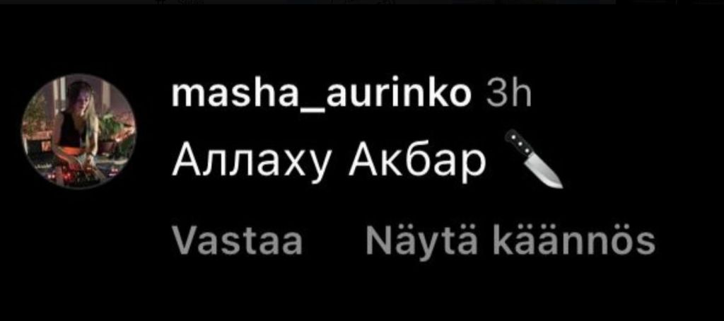 Alemmassa viestissä lukee allahu Akbar ja perässä on veitsen kuva.
