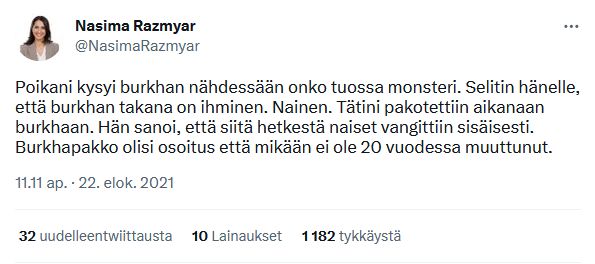 SDP:n Nasima Razmyar kirjoitti elokuussa 2021: