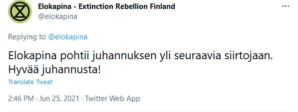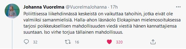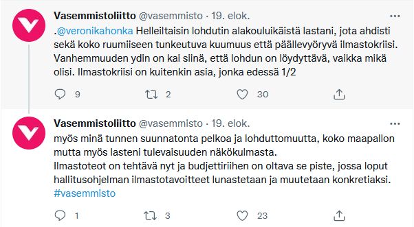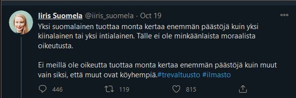 Yllä olevan vihreille tyypillisen ulostulon jälkeen, nähtiin vain päivää myöhemmin paljon populistisempi twiittaus:
