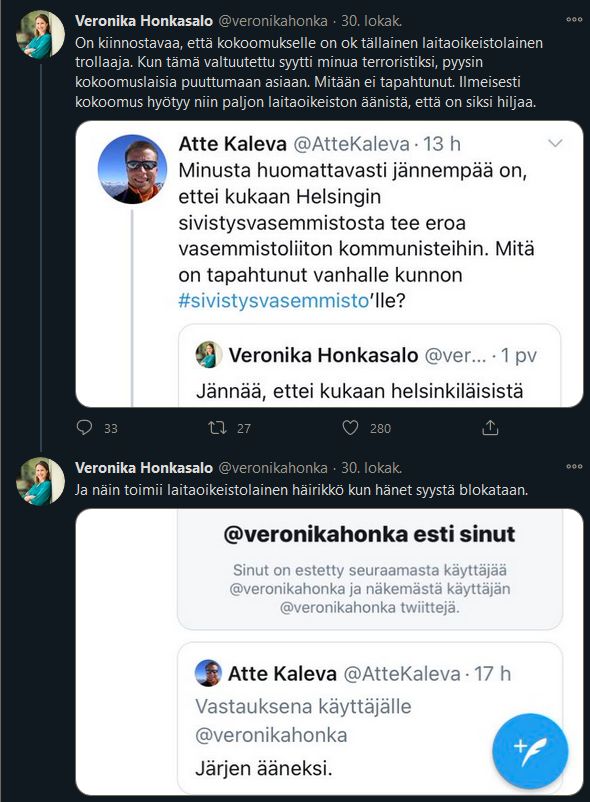 Tämän artikkelin aihe ei kuitenkaan ole Honkasalo, vaan vasemmisto. Honkasalo on varmasti mukava ja älykäs ihminen ja keskustelu hänen kanssaan olisi avartavaa. Esille nostetut twiitit ovat yksittäisiä ja siksi kärjistäviä.