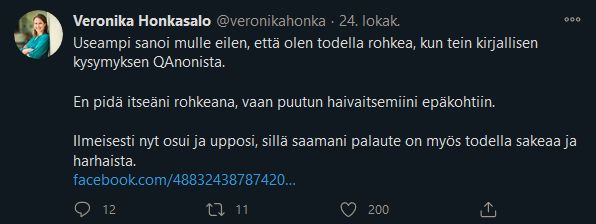 Intersektionaalisen feminismin suuri murhe on QAnon. Honkasalo toivoo kirjallisessa kysymyksessään valtiovallalta mekanismeja suojelemaan nuoria tältä “kultilta”. Sekä sisäministeriötä kehittämään “exit”-prosessin kyseiseen yhteisöön päätyneille.