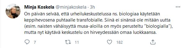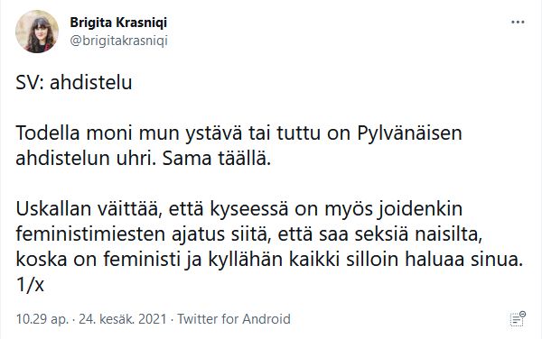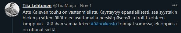 Hänen osaltaan palkintoon oikeutti kuitenkin tehokas uhriaseman ottaminen intersektionaalisen feminismin hengessä. Lisäarvoa toi uhriasemasta heitetyt vasemmistopopulistiset termit “laitaoikeistolainen”, “trollaaja” ja “häirikkö”.
