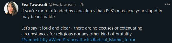 Vasemmisto ei ole suonut terrorismille ainuttakaan twiittiä, Paavo Arhinmäkeä lukuun ottamatta. Erityisen silmiinpistävää on ollut Suomen pääministerin Sanna Marinin hiljaisuus. Muut Euroopan johtajat ottivat kovasanaisesti kantaa islamisteja vastaan ja ilmoittivat puolustavansa eurooppalaisia arvoja. Marin ei.