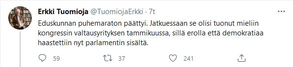 Tuomiojan mukaan se, että kansanedustaja käyttää itselleen laissa määrättyä oikeutta ja velvollisuutta, tarkoittaa parlamentin valtausyritystä.