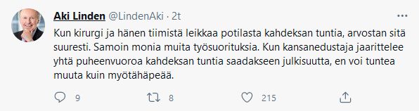 Myötähäpeä herää myös SDP:n Aki Lindenin kohdalla, joka ei selvästikään kuunnellut sanaakaan itse puheesta, mutta kokee voivansa arvioida sen sisältöä. Ylimielisyys ei paista ainoastaan hänen kasvoistaan. Linden muistetaan myös vakavista pimittämisepäillyistä.