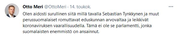 Koska Merellä ei ilmeisesti ole paljoakaan itsenäistä ajatustoimintaa, olisi ollut liikaa vaatia häntä kuuntelemaan Tynkkysen huolellista ja johdonmukaista argumentointia elpymispakettia vastaan. Otolle luontevampaa olikin seurata, kenellä on maski naamalla ja kenellä ei.