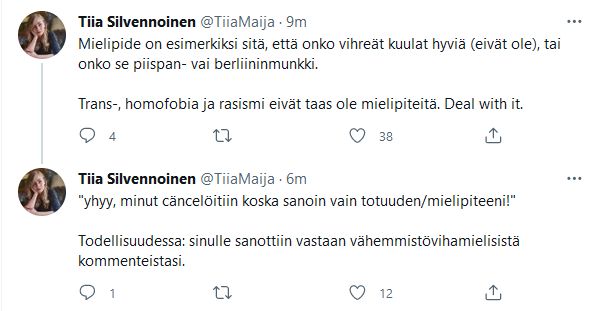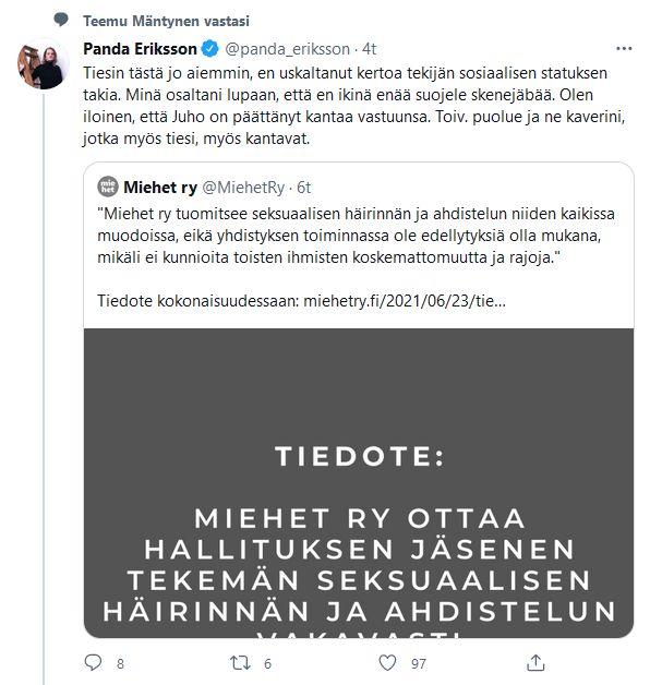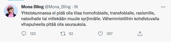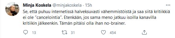 Saatuaan runsaasti palautetta ulostulostaan, alkoi kansanedustaja korjata sosiaalista pääomaa äänestäjiltään intersektionaalisen feminismin keinoin eli uhriutumalla: