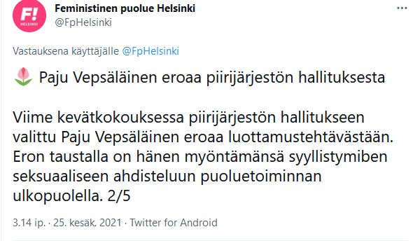 Vasemman laidan intersektionaalinen feminismi tekee kuitenkin itsensä näköistä politiikkaa. Maailman ja Suomen tämän hetken ongelmia katsellessa, vaikuttaa sen fokus oleva hyvin toissijaisissa asioissa.
