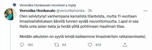 Vasemmistoliitto twiittasi Honkasalon puheen osan. Siinä Honkasalo kertoo kuinka helleiltaisin lohduttaa alakouluikäistä lastaan, jota ahdistaa ruumiiseen tunkeva kuumuus lämpimänä kesäpäivänä.