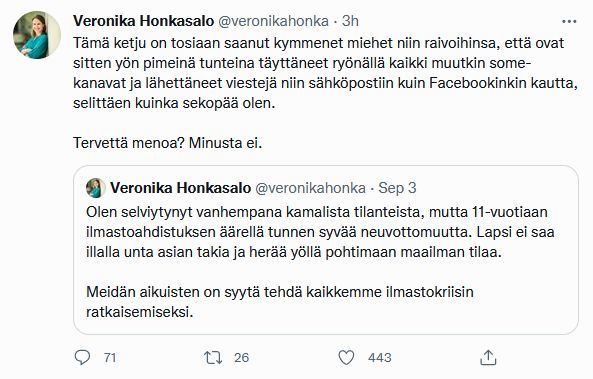Vasemmistoliiton kansanedustaja jaintersektionaalinen feministi Veronika Honkasalo päätti kuitenkin jostain syystä alkaa käyttää omaa jälkikasvuaan osana kauhukuvien maalaamista. Ensimmäinen viite tästä saatiin pari viikkoa takaperin vasemmistoliiton kesäkokouksessa 19.päivä elokuuta.