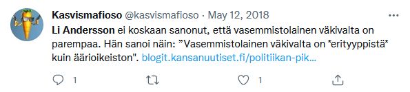Mutta pysähdytään hetkeksi ensimmäisen twiitin lainaukseen Li Anderssonilta: “Vasemmistolainen väkivalta on *erityyppistä* kuin äärioikeiston.” Lausetta on sittemmin runsaasti selitelty.