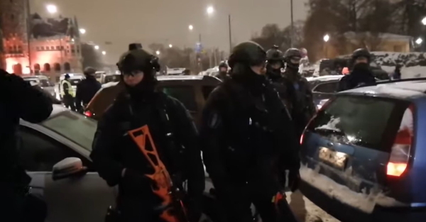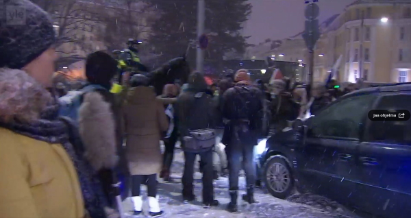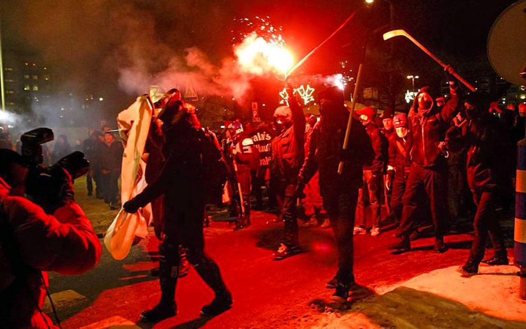(Vasemmistomellakoitsijoita aseineen itsenäisyyspäivänä 2013. Muiden muassa kuutta poliisihevosta hakattiin ja kivitettiin illan aikana)