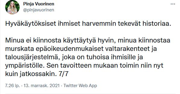 Hänen olisi kuitenkin suonut käyvän sosiaalipolitiikan kurssien ohella myös useammalla historianluennolla. Silloin hän tietäisi, mitä naiset ovat tehneet suomalaisen hyvinvointivaltion eteen, raivanneet peltoja ja taistelleet maansa puolesta. Hän ymmärtäisi, ettei valkoinen iho tee suomalaisesta naisesta ketään muuta epäedustavampaa, päinvastoin. Ei myöskään kenestäkään valkoihoisesta miehestä.