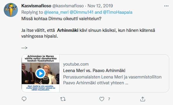 Marraskuussa 2021 toisella vasemmistoon tiukasti linkittyvällä anonyymillä 2000 seuraajan Twitter-tilillä, Kasvismafioso - joka muuten perustettiin vuonna 2017 kun Dellingeriin linkitetty tili kävi kuumimmillaan - julkaistiin käskymuotoinen kehotus: “Raiskatkaa persujen lapset!!!”